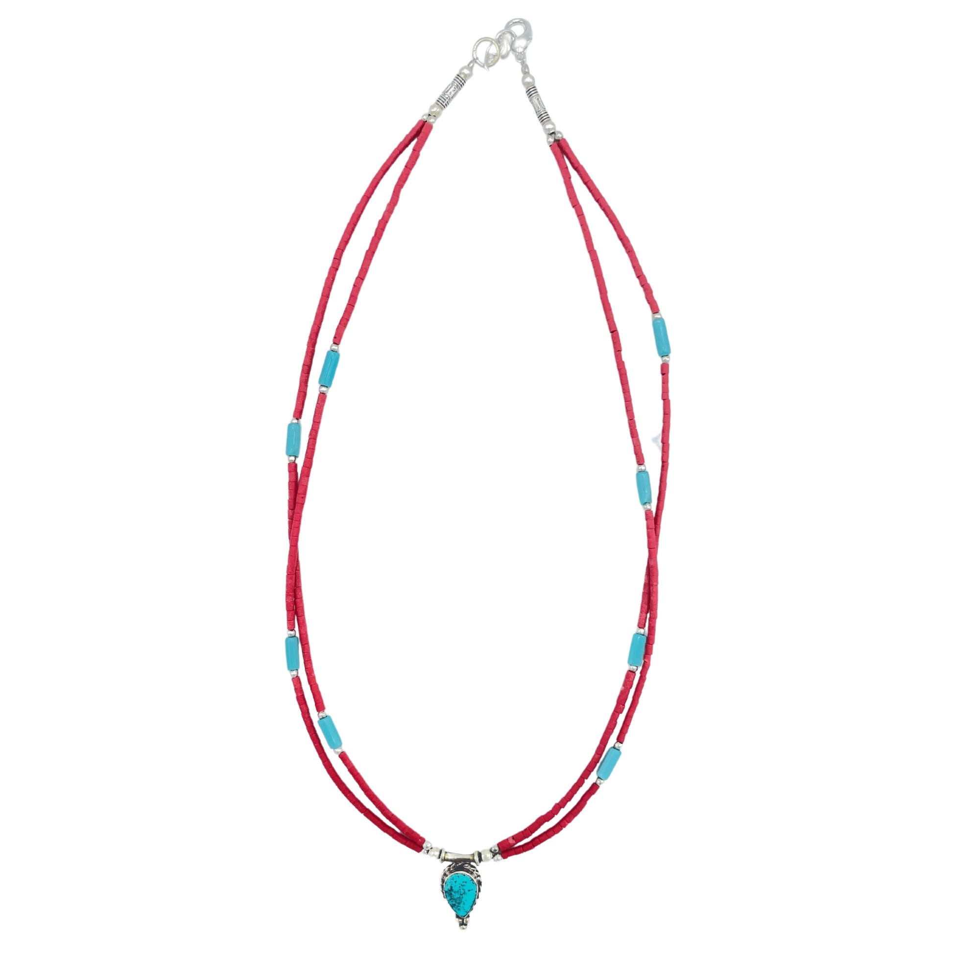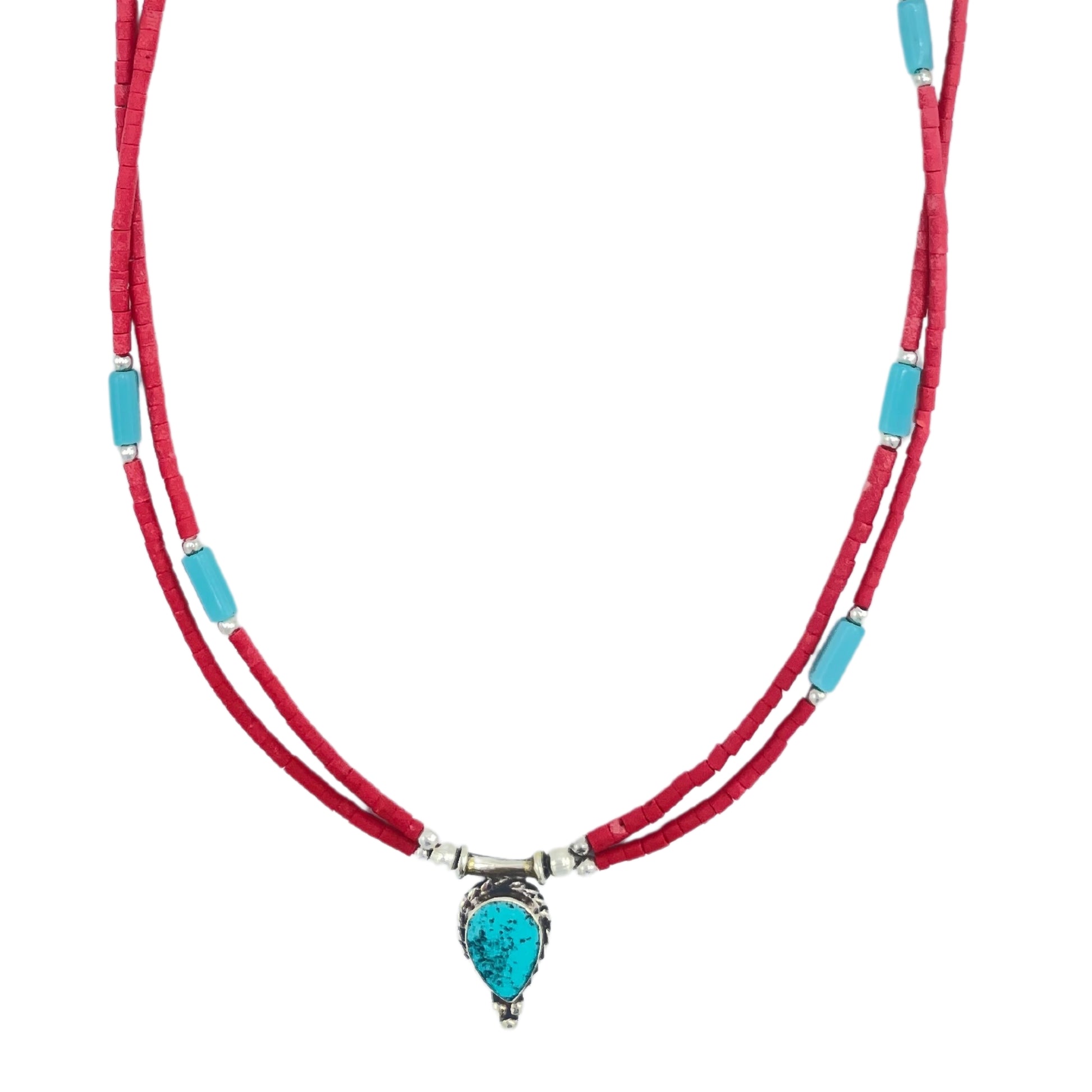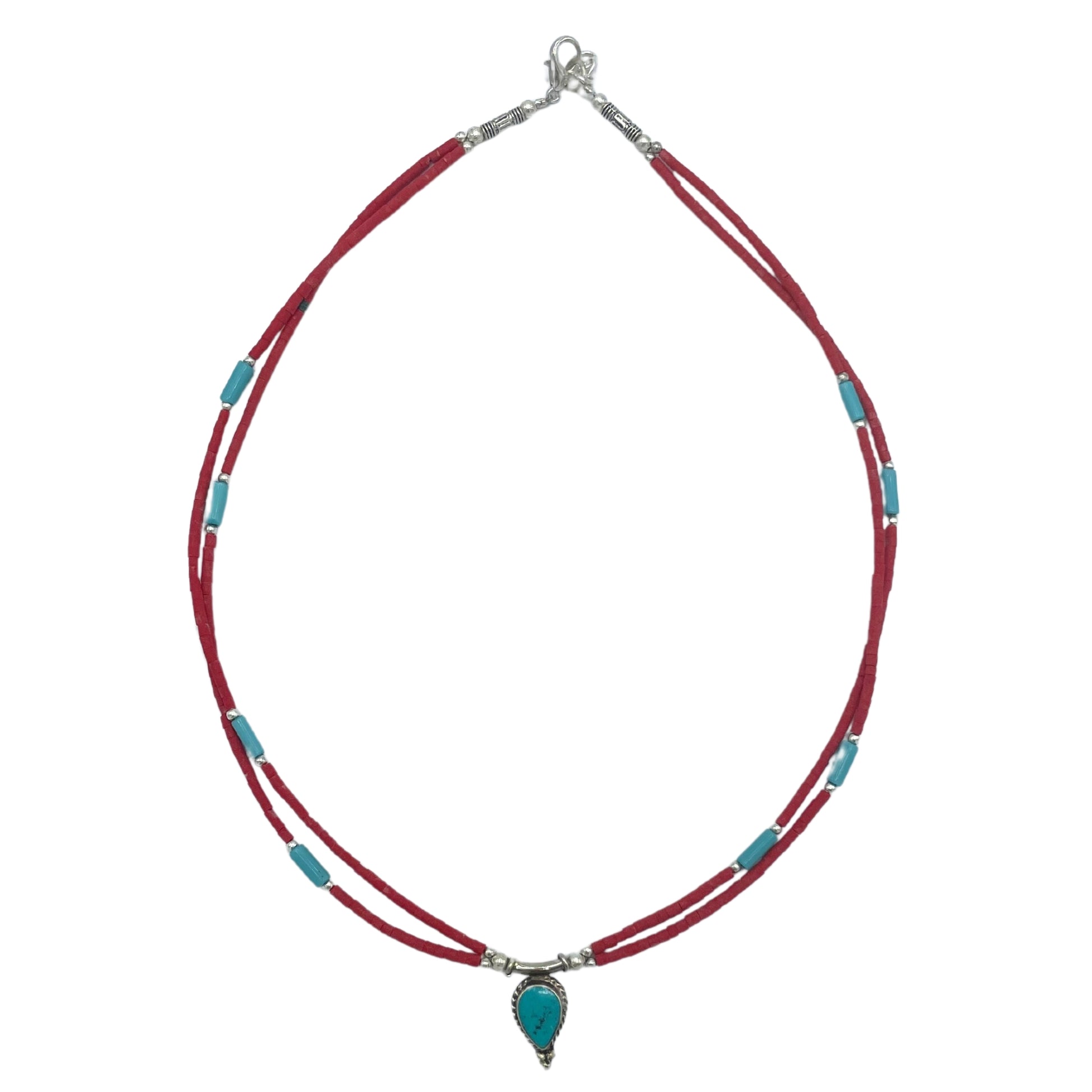 Nepalese Extra Fine Two Line Necklace - Pink & Turquoise Pendant