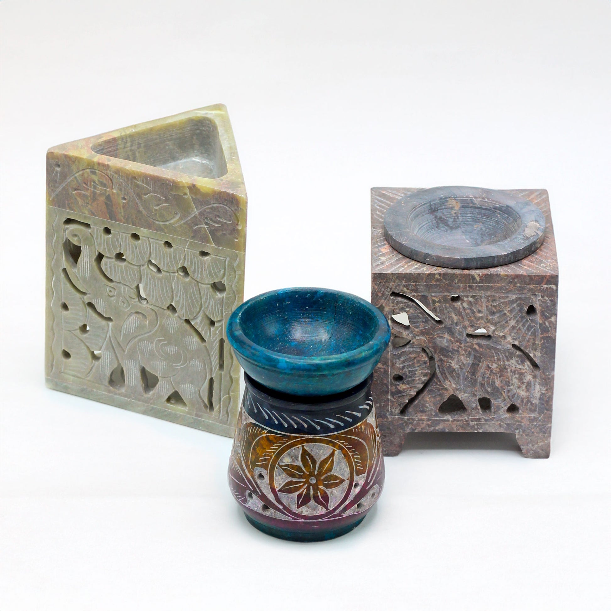 This square soapstone oil burner is a stunning addition to any home or meditation area. Expertly crafted in India, it showcases intricate elephant carvings on all four sides, representing strength and wisdom. The natural soapstone material, with its earthy hues, ensures each piece is uniquely rustic and full of character. Perfect for diffusing essential oils or melting wax, this burner seamlessly blends functionality with decorative charm, creating a calm and inviting ambiance. The square design, supported by sturdy legs, enhances both its stability and artisanal aesthetic.